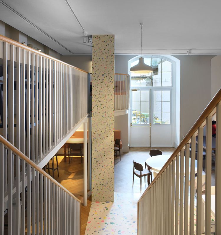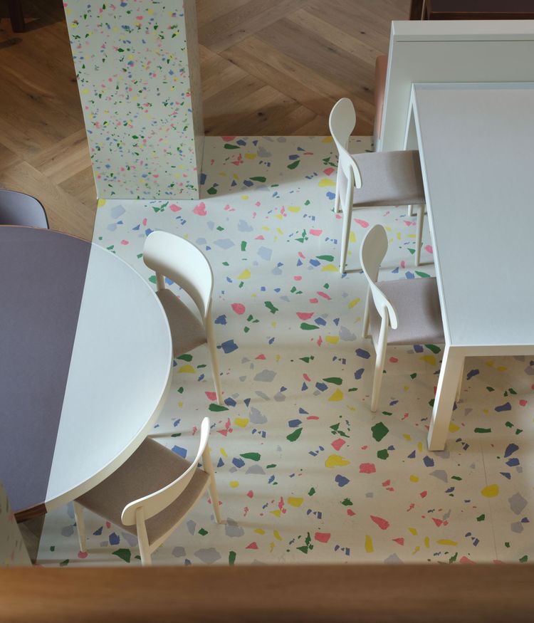 In the café four existing columns define a central all-white space. The square columns are decorated with a contemporary interpretation of the New Wing entrance columns’ 19th century hand-painted terrazzo, created with an assortment of laser-cut aluminium stencils. A matching terrazzo patterned floor is created with water-cut natural linoleum.